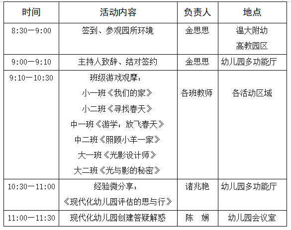 为进一步提升幼儿园教育质量,展示温大附幼现代化优质园的教育成果,促进园所之间的交流与学习,特开展现代化优质园开放观摩活动。此次活动旨在分享温大附幼在创建工作、课程建设、教育教学、环境创设等方面的实践经验,同时为幼教同行提供学习与交流的平台。现将活动具体安排如下:
