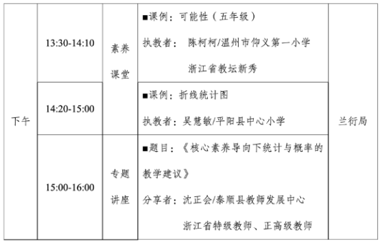 为提升教师专业素养,追寻“有学生、有数学、有技术”的数学课堂。现决定举行温州市陈柯柯“名师送教”工作室新课标下“统计与概率”教学实践展示活动,活动安排具体如下: