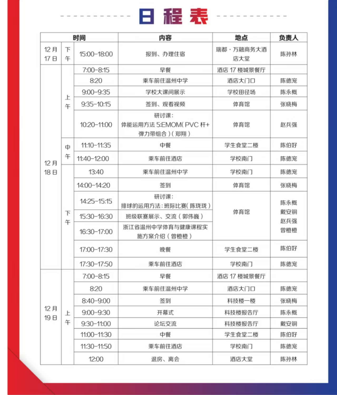本周三、四两天在温州中学举行高中体育与健康“关键问题解决”专题研训活动,请全体老师参与。